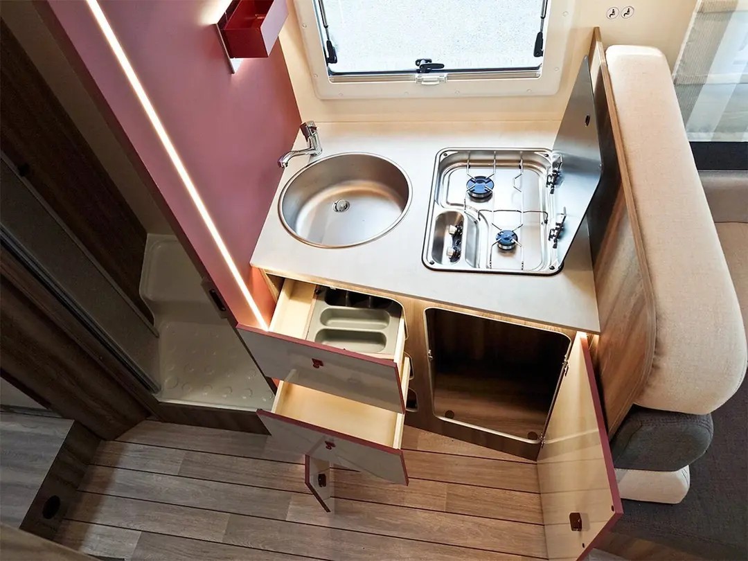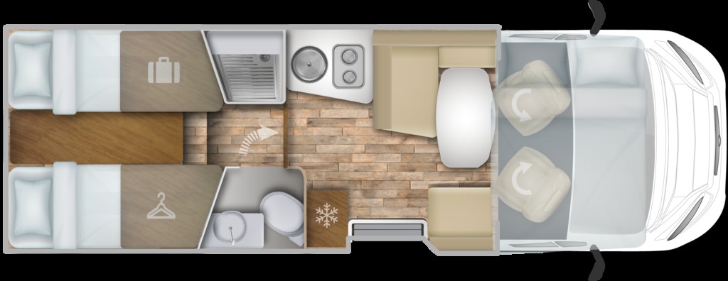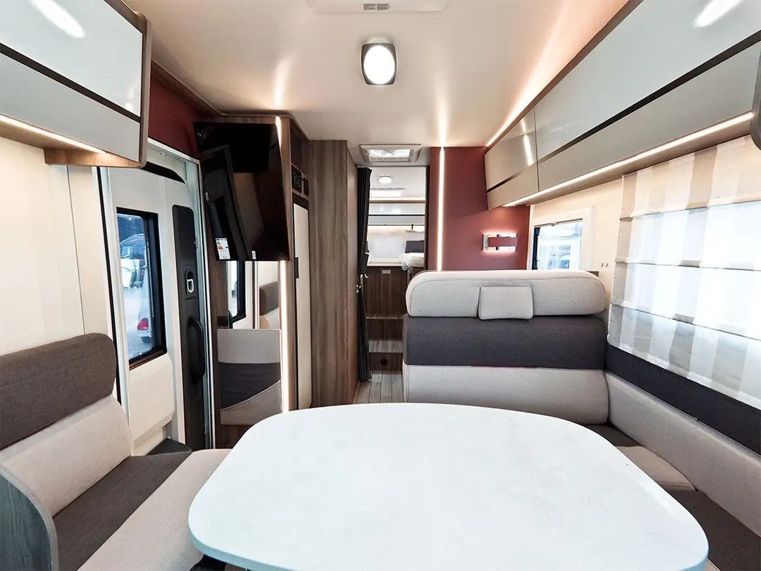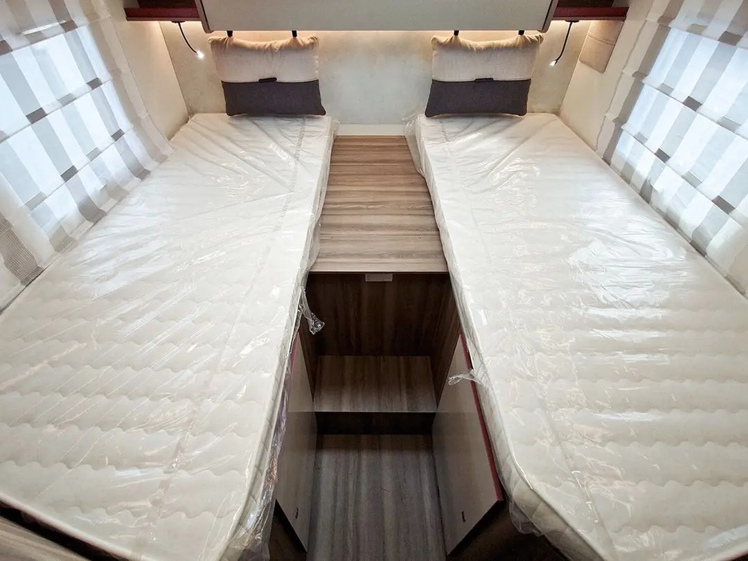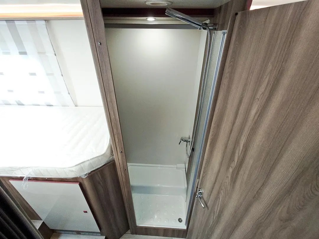 | Schlafmöglichkeit für 6 Personen, Einzelbetten im Heck 210x80 und 210x80, Alkoven 211x160, zusätzliches Hilfsbett in der Dinette 216x65, Truma Dieselheizung mit elektrischer Option, automatischer Kühlschrank, Warmwasserboiler, getrennte Dusche, Dachventilator, Rahmenfenster, uvm. |