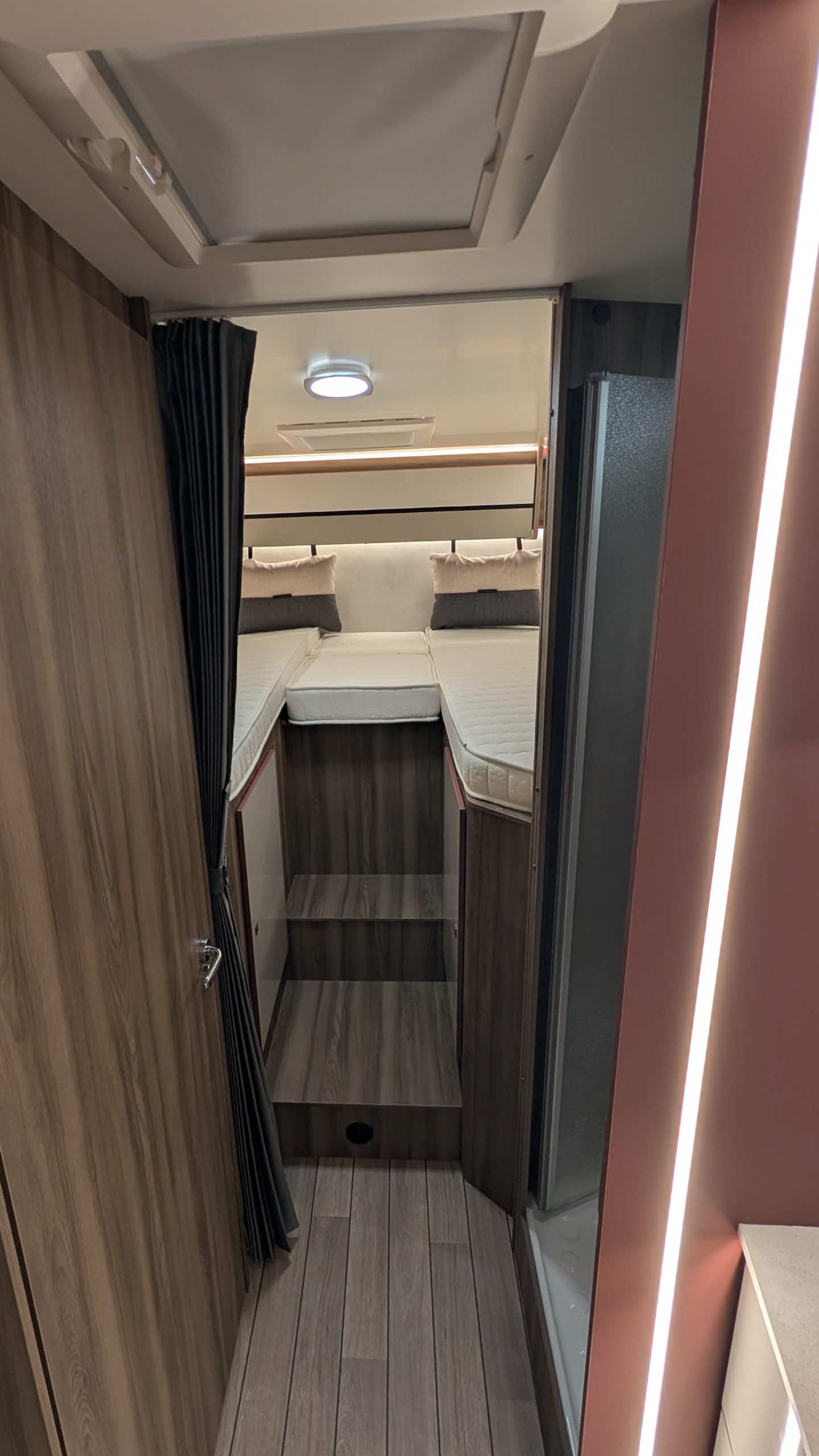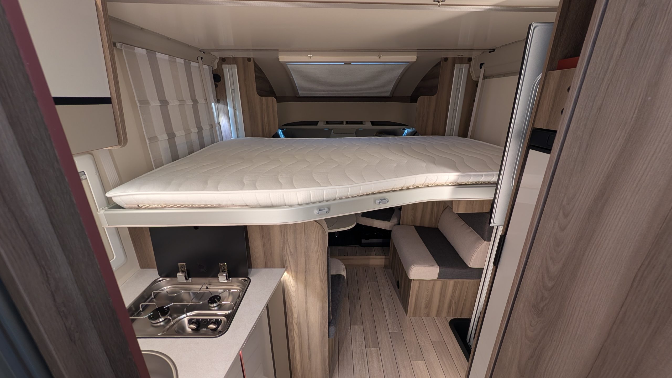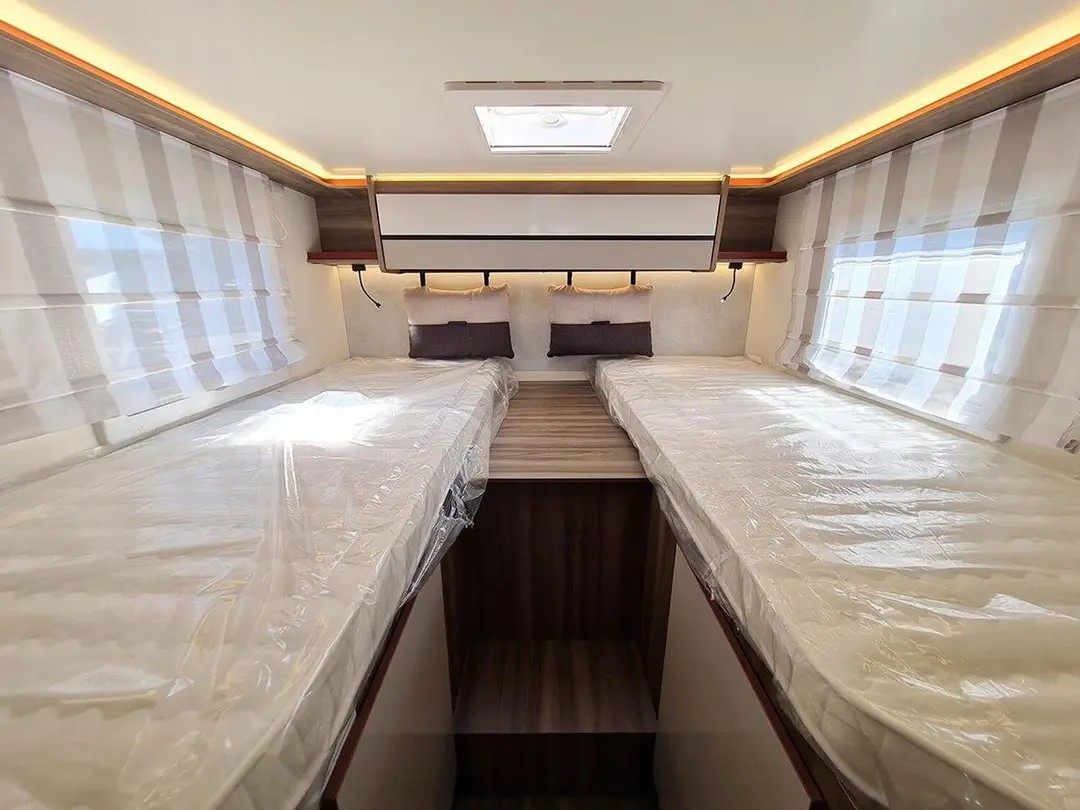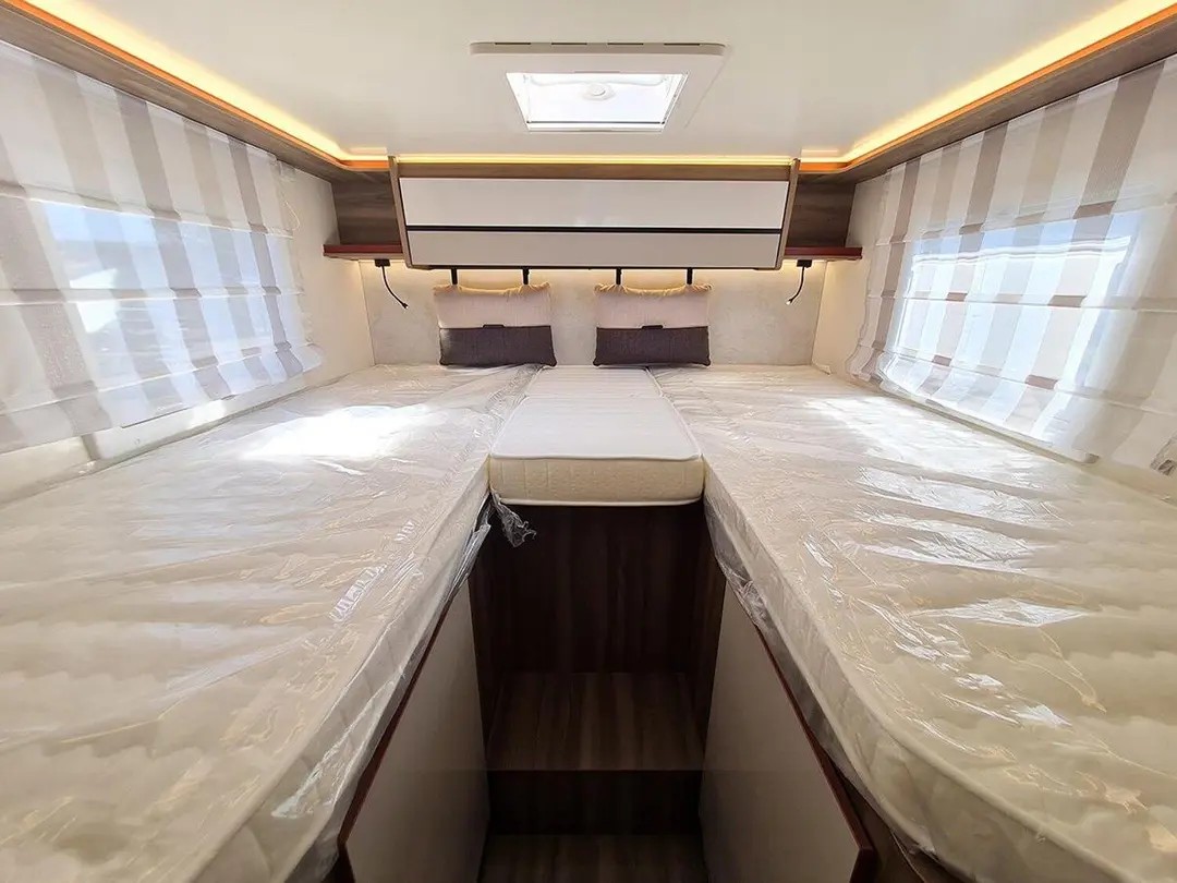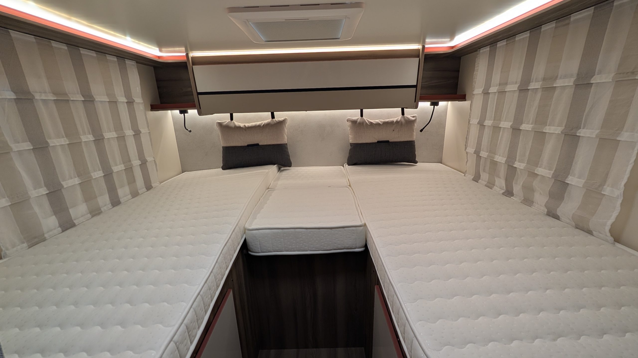 | Schlafmöglichkeit für 5 Personen, Einzelbetten im Heck 210x80 und 210x80, Hubbettt 203x135, zusätzliches Hilfsbett in der Dinette 216x65, Truma Dieselheizung mit elektrischer Option, automatischer Kühlschrank, Warmwasserboiler, uvm. |