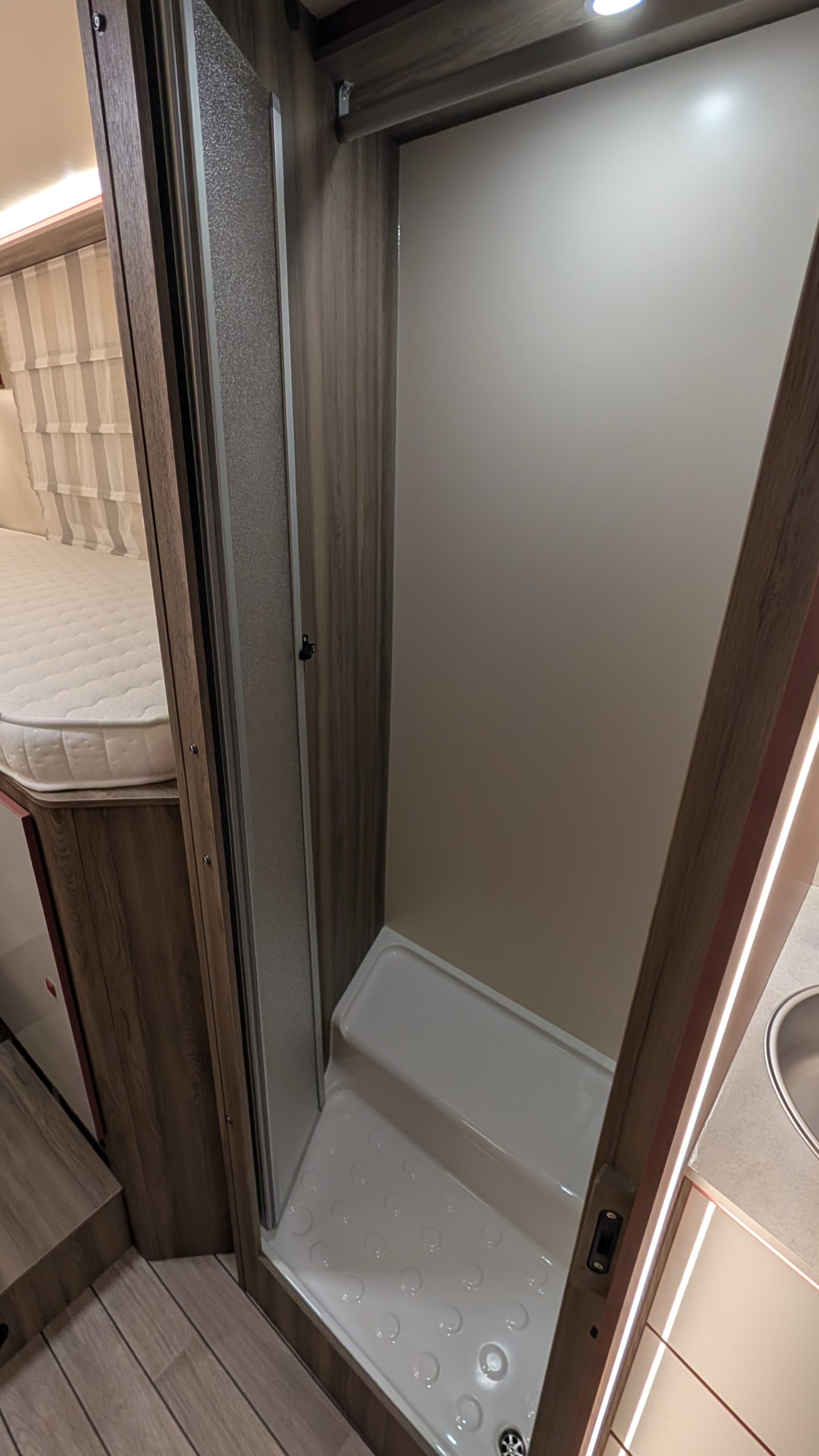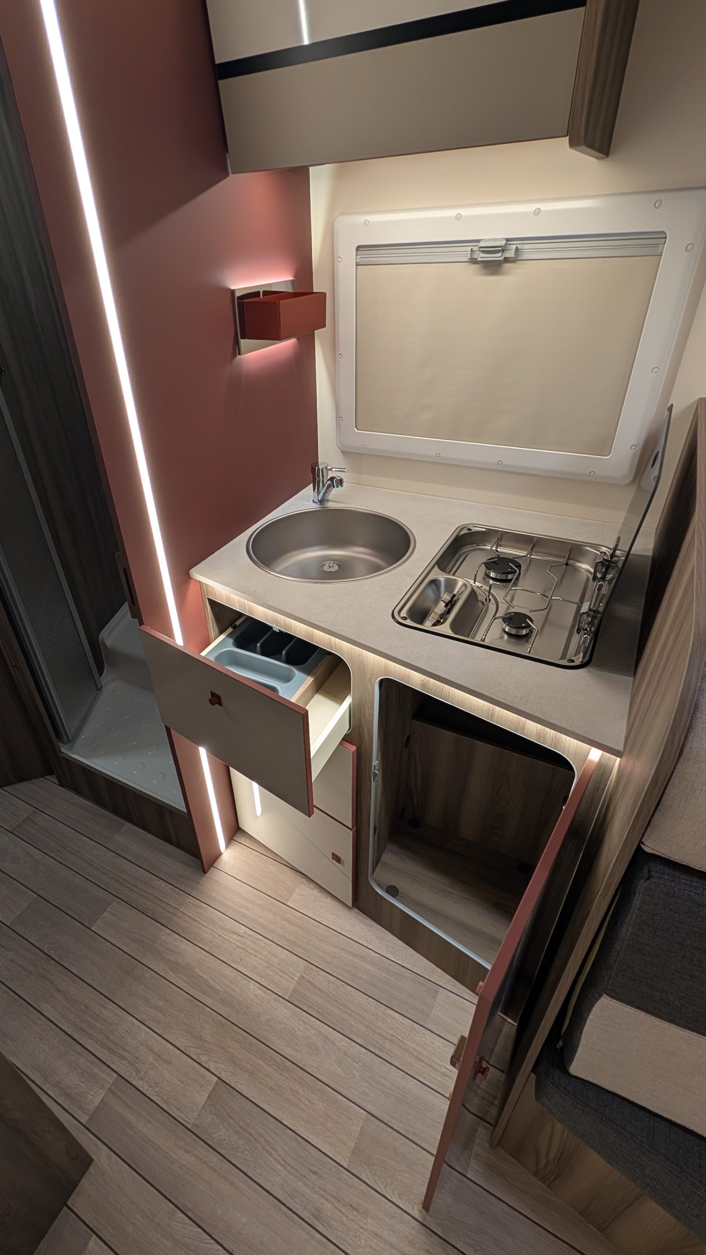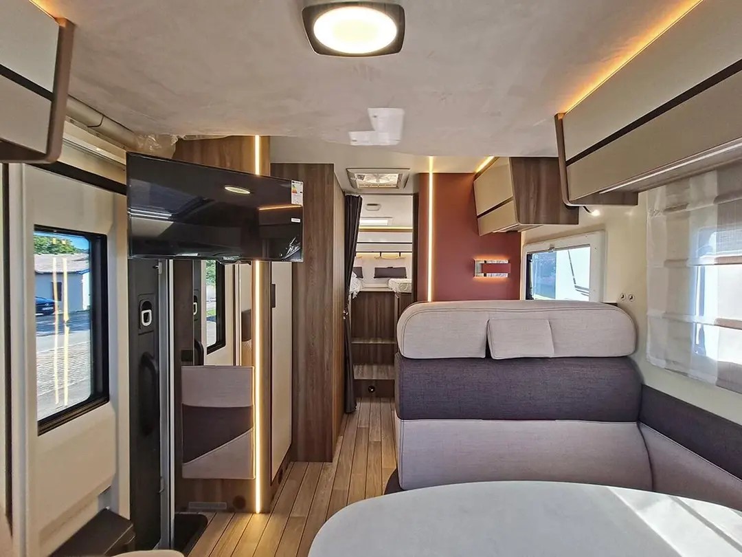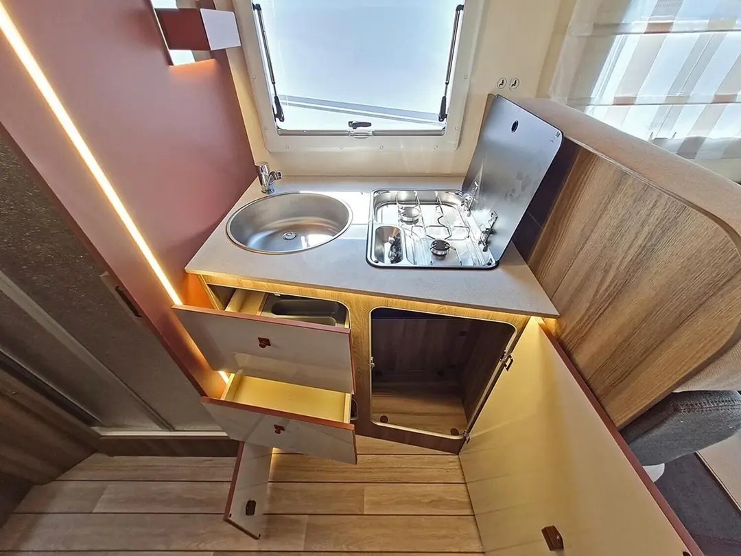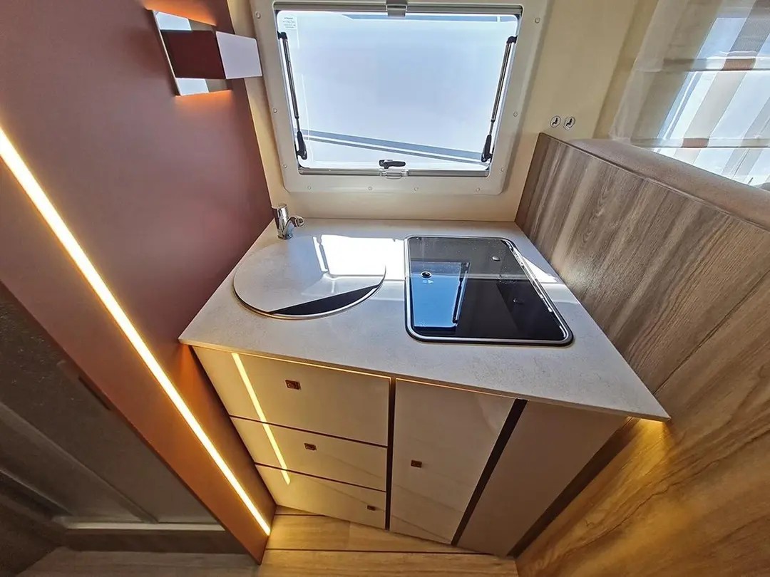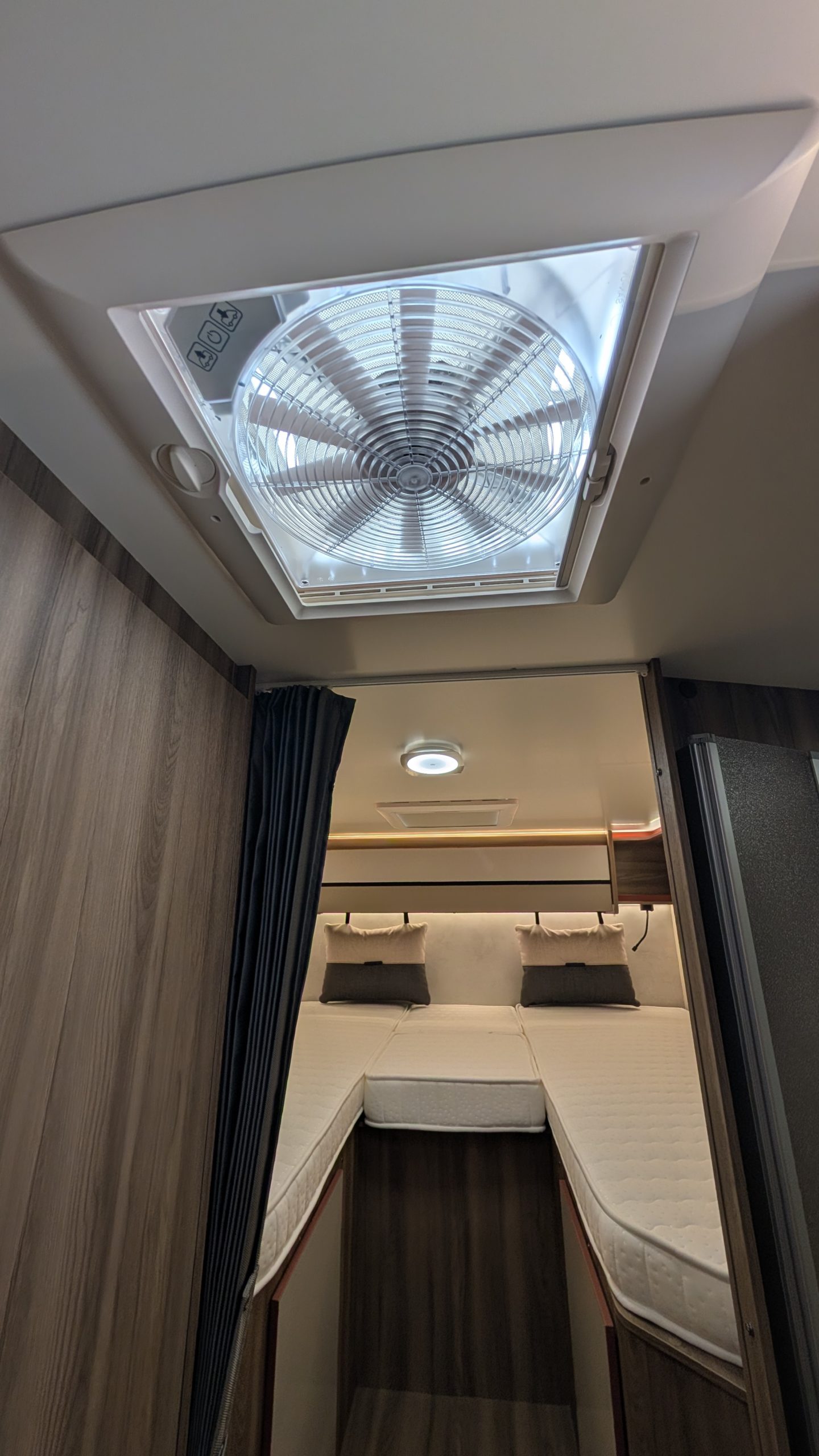 | Schlafmöglichkeit für 5 Personen, Einzelbetten im Heck 210x80 und 210x80, Hubbettt 203x135, zusätzliches Hilfsbett in der Dinette 216x65, Truma Dieselheizung mit elektrischer Option, automatischer Kühlschrank, Warmwasserboiler, uvm. |